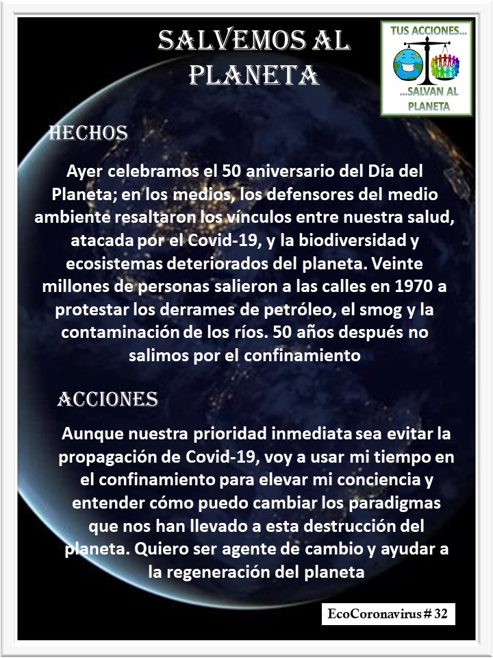EcoCoronavirus # 32 El Día del Planeta José Antonio Cárdenas Marroquín Uncategorized April 23, 2020 1 Minute Lydia P. Vignau y José A. Cárdenas Mayor Información: El Día del Planeta Share this: Share on X (Opens in new window) X Share on Facebook (Opens in new window) Facebook Like Loading... Published April 23, 2020