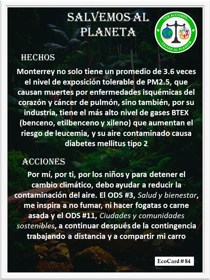 EcoCard # 84 Contaminación del aire José Antonio Cárdenas Marroquín Uncategorized August 28, 2020August 29, 2020 1 Minute Lydia P. Vignau y José A. Cárdenas Más Información: Escribe tu ciudad en el mapa Más Información: Gases tóxicos en Monterrey Más Información: Efecto de la contaminación en la salud Share this: Share on X (Opens in new window) X Share on Facebook (Opens in new window) Facebook Like Loading... Published August 28, 2020August 29, 2020