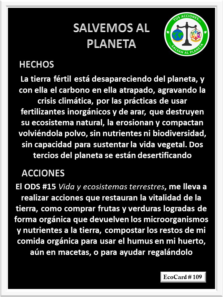 EcoCard # 109 La tierra fértil desaparece José Antonio Cárdenas Marroquín Uncategorized September 28, 2020 1 Minute Lydia P. Vignau y José A. Cárdenas Más Información: Why soil is dissapearing Share this: Click to share on X (Opens in new window) X Click to share on Facebook (Opens in new window) Facebook Like Loading... Published September 28, 2020