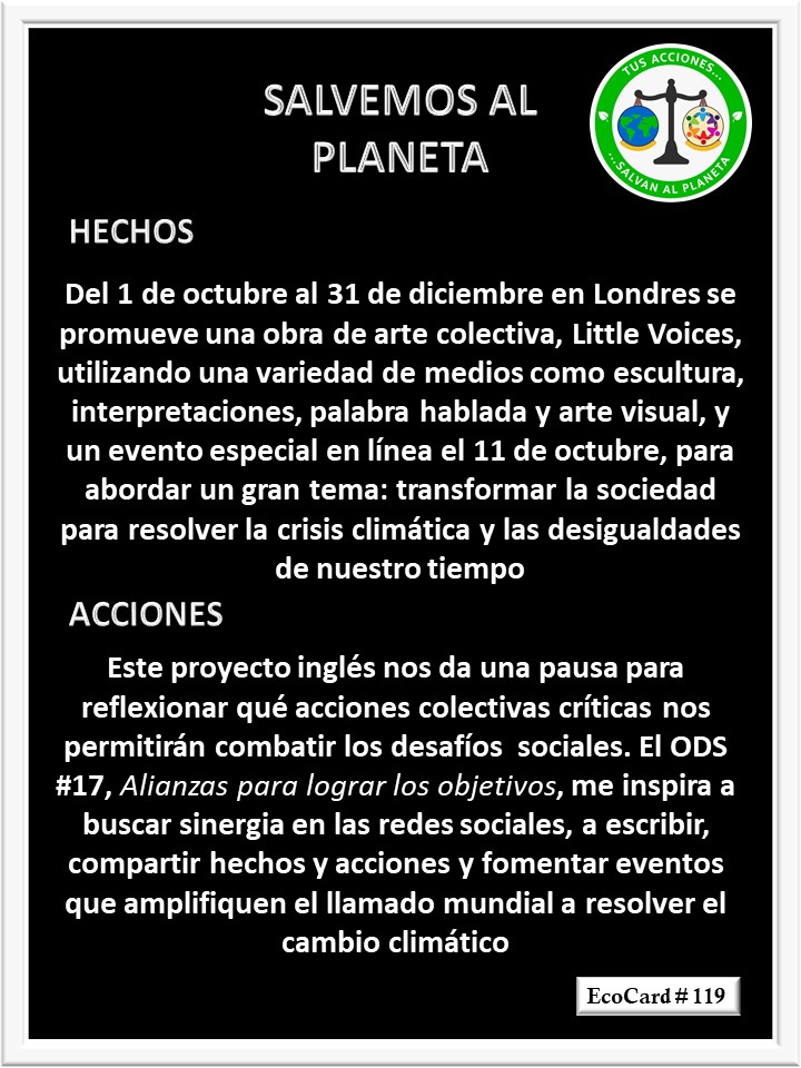 EcoCard # 119 Transformar la sociedad José Antonio Cárdenas Marroquín Uncategorized October 9, 2020 1 Minute Lydia P. Vignau y José A. Cárdenas Más Información: Little Voices Reservaciones Share this: Share on X (Opens in new window) X Share on Facebook (Opens in new window) Facebook Like Loading... Published October 9, 2020