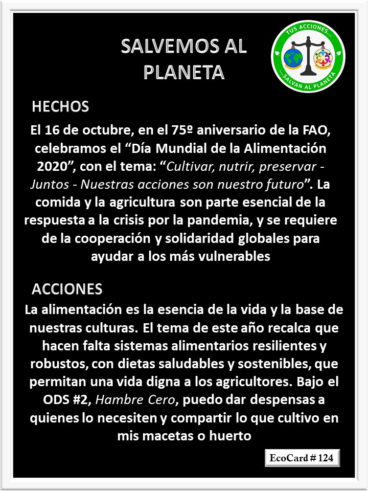 EcoCard # 124 Cultivar, nutrir, preservar José Antonio Cárdenas Marroquín Uncategorized October 14, 2020 1 Minute Lydia P. Vignau y José A. Cárdenas Más Información: World food day Share this: Share on X (Opens in new window) X Share on Facebook (Opens in new window) Facebook Like Loading... Published October 14, 2020