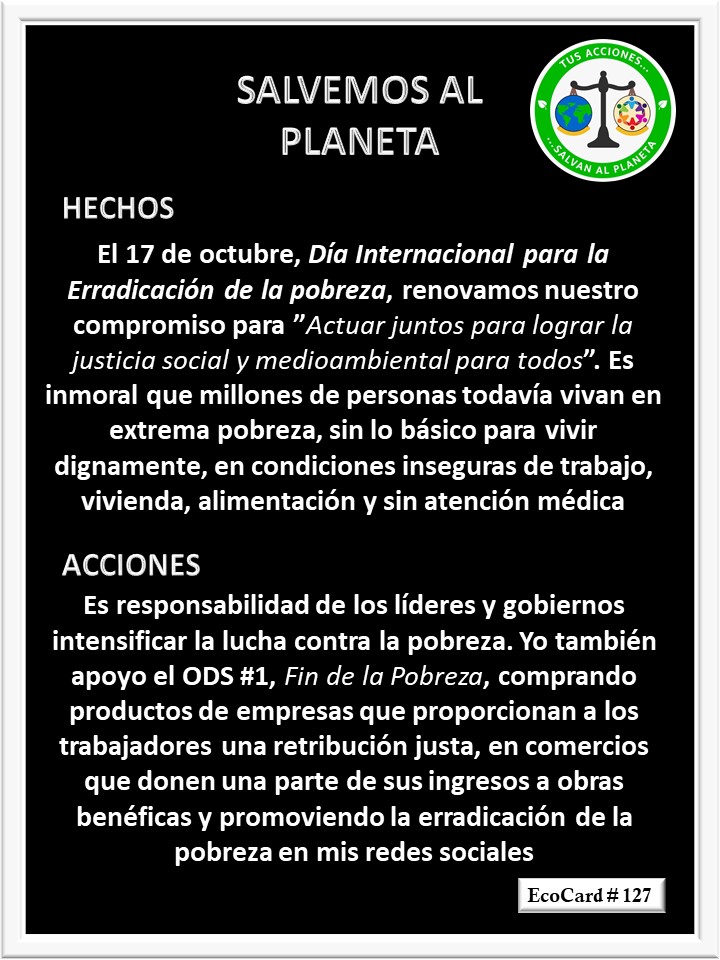 EcoCard # 127 La lucha contra la pobreza José Antonio Cárdenas Marroquín Uncategorized October 18, 2020 1 Minute Lydia P. Vignau y José A. Cárdenas Más Información: Eradicating poverty Share this: Share on X (Opens in new window) X Share on Facebook (Opens in new window) Facebook Like Loading... Published October 18, 2020