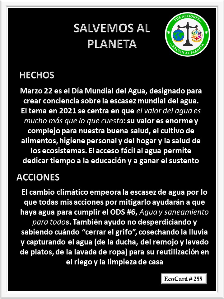 EcoCard # 255 Día mundial del agua José Antonio Cárdenas Marroquín Uncategorized March 22, 2021 1 Minute Lydia P. Vignau y José A. Cárdenas Más Información: Clean water Más Información: World Water Day Share this: Click to share on X (Opens in new window) X Click to share on Facebook (Opens in new window) Facebook Like Loading... Published March 22, 2021