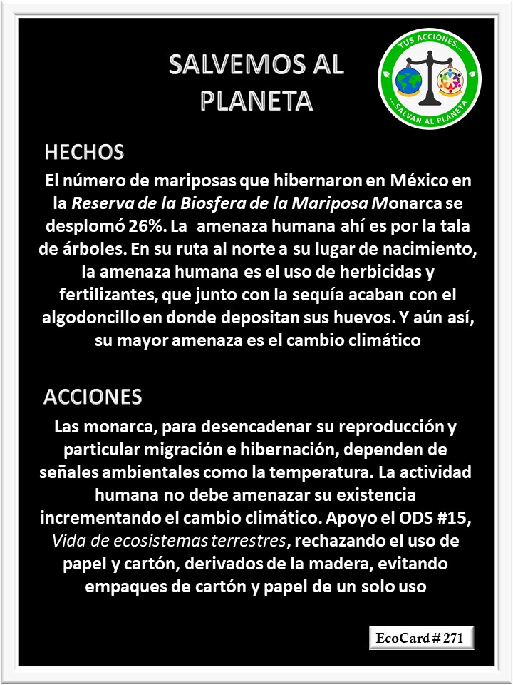 EcoCard # 271 La amenaza humana José Antonio Cárdenas Marroquín Uncategorized April 9, 2021April 9, 2021 1 Minute Lydia P. Vignau y José A. Cárdenas Más Información: Monarch butterflies Más Información: Butteflies and the environment Share this: Click to share on X (Opens in new window) X Click to share on Facebook (Opens in new window) Facebook Like Loading... Published April 9, 2021April 9, 2021
