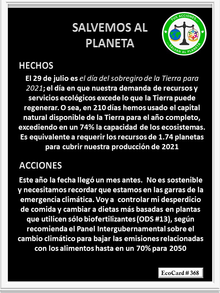 EcoCard # 368 El día del sobregiro José Antonio Cárdenas Marroquín Uncategorized July 30, 2021July 30, 2021 1 Minute Lydia P. Vignau y José A. Cárdenas Más Información: Overshoot day Share this: Share on X (Opens in new window) X Share on Facebook (Opens in new window) Facebook Like Loading... Published July 30, 2021July 30, 2021