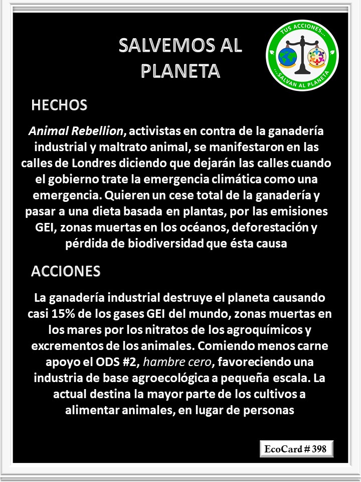 EcoCard # 398 La ganadería industrial José Antonio Cárdenas Marroquín Uncategorized September 1, 2021September 1, 2021 1 Minute Lydia P. Vignau y José A. Cárdenas Más Información: Vegan activists Más Información: Menos es más Share this: Click to share on X (Opens in new window) X Click to share on Facebook (Opens in new window) Facebook Like Loading... Published September 1, 2021September 1, 2021