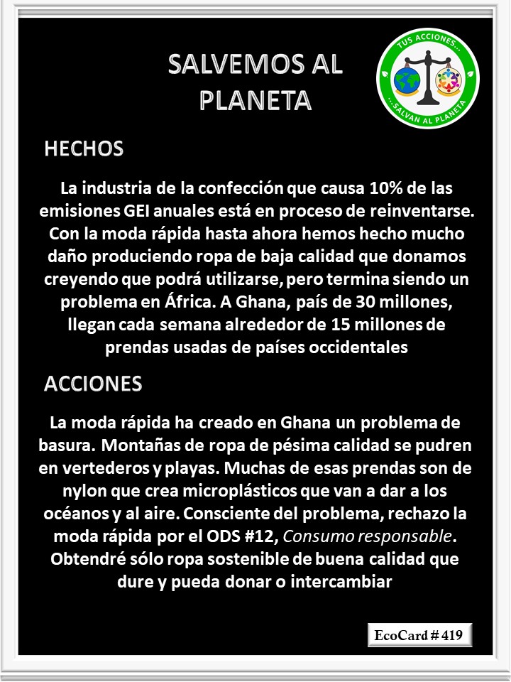 EcoCard # 419 La moda rápida José Antonio Cárdenas Marroquín Uncategorized September 25, 2021 1 Minute Lydia P. Vignau y José A. Cárdenas Más Información: Fast fashion Share this: Share on X (Opens in new window) X Share on Facebook (Opens in new window) Facebook Like Loading... Published September 25, 2021