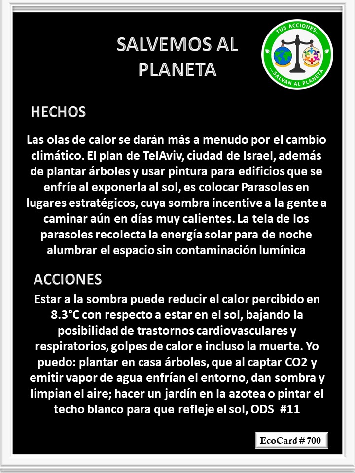 EcoCard # 700 Las olas de calor José Antonio Cárdenas Marroquín Uncategorized August 26, 2022 1 Minute Lydia P. Vignau y José A. Cárdenas Más información: Bring shade to the cities Share this: Click to share on X (Opens in new window) X Click to share on Facebook (Opens in new window) Facebook Like Loading... Published August 26, 2022