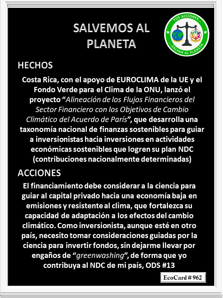 EcoCard # 962 Finanzas sostenibles José Antonio Cárdenas Marroquín Uncategorized May 28, 2023 1 Minute Lydia P. Vignau y José A. Cárdenas Más información: Costa Rica´s sustainable financial project Share this: Share on X (Opens in new window) X Share on Facebook (Opens in new window) Facebook Like Loading... Published May 28, 2023