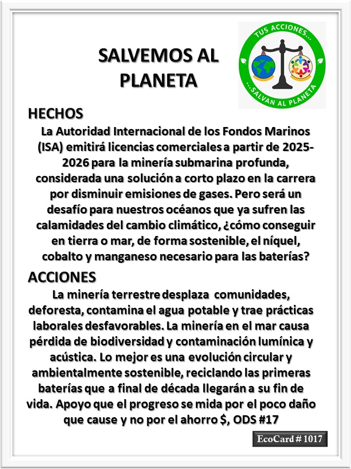 EcoCard # 1017 La minería en el mar José Antonio Cárdenas Marroquín Uncategorized July 25, 2023July 25, 2023 1 Minute Lydia P. Vignau y José A. Cárdenas Más información: Sea miningShare this: Share on X (Opens in new window) X Share on Facebook (Opens in new window) Facebook Like Loading... Published July 25, 2023July 25, 2023