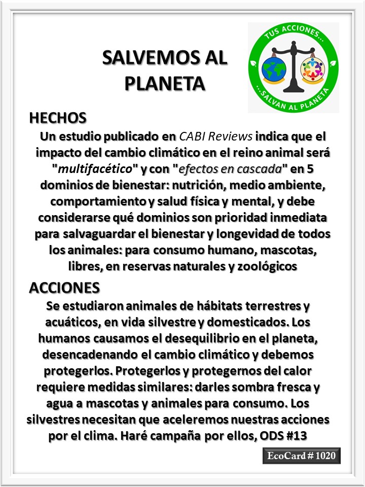 EcoCard # 1020 Dominios de bienestar animal José Antonio Cárdenas Marroquín Uncategorized July 28, 2023 1 Minute Lydia P. Vignau y José A. Cárdenas Más información: Impacts of climate change on animals will be multi-facetedShare this: Click to share on X (Opens in new window) X Click to share on Facebook (Opens in new window) Facebook Like Loading... Published July 28, 2023