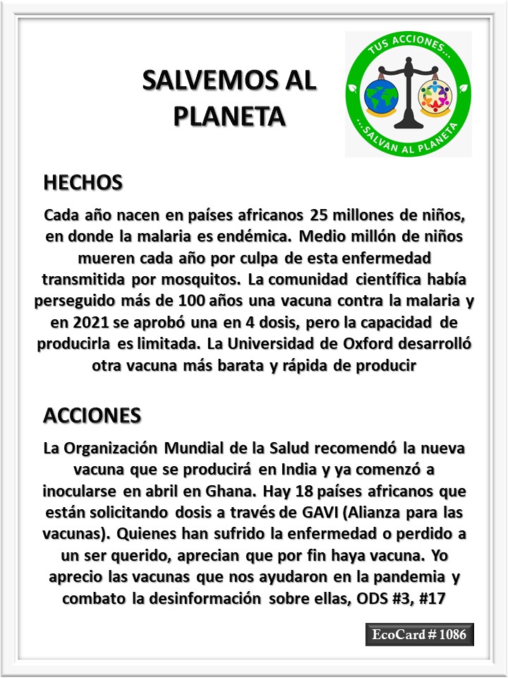 EcoCard #1086 Una nueva vacuna José Antonio Cárdenas Marroquín Uncategorized October 7, 2023October 7, 2023 1 Minute Lydia P. Vignau y José A. Cárdenas Más información: La nueva vacuna contra la malaria abre la puerta a llegar a todos los niños que la necesitan en África Share this: Share on X (Opens in new window) X Share on Facebook (Opens in new window) Facebook Like Loading... Published October 7, 2023October 7, 2023