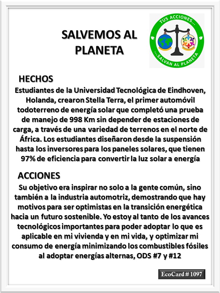 EcoCard #1097 Hacia un futuro sostenible José Antonio Cárdenas Marroquín Uncategorized October 18, 2023 1 Minute Lydia P. Vignau y José A. Cárdenas Más información: Solar-Powered Car Completes 620-Mile Test Drive Across North Africa Share this: Share on X (Opens in new window) X Share on Facebook (Opens in new window) Facebook Like Loading... Published October 18, 2023