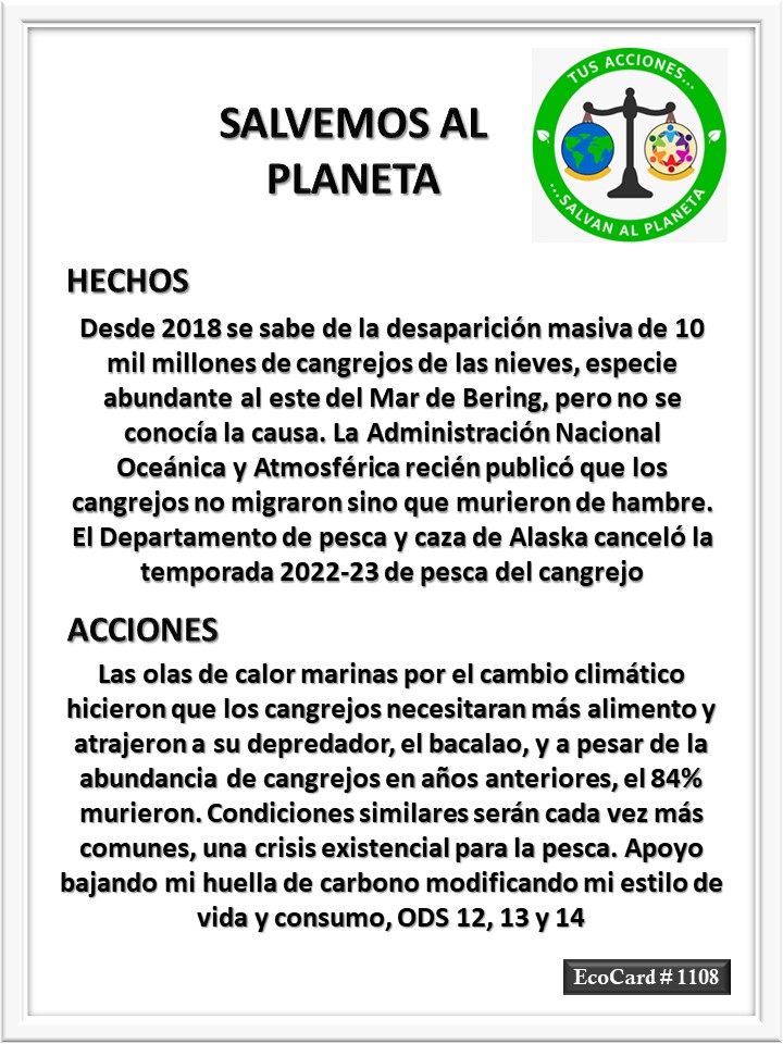 EcoCard #1108 Desaparición masiva José Antonio Cárdenas Marroquín Uncategorized October 29, 2023 1 Minute Lydia P. Vignau y José A. Cárdenas Más información: The collapse of eastern Bering Sea snow crab Más información: 10 billion Crabs suddenly vanished from the Bering Sea. Now we know why. Share this: Click to share on X (Opens in new window) X Click to share on Facebook (Opens in new window) Facebook Like Loading... Published October 29, 2023