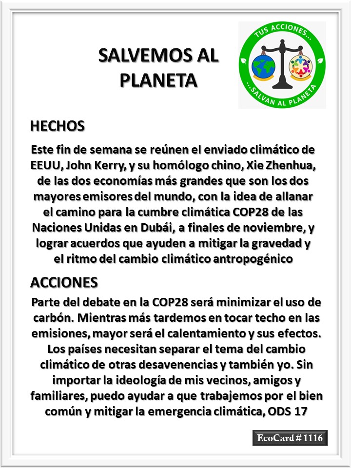 EcoCard #1116 Minimizar el uso del carbón José Antonio Cárdenas Marroquín Uncategorized November 6, 2023 1 Minute Lydia P. Vignau y José A. Cárdenas Más información: US, China to set the stage for COP28 with high stakes meetingShare this: Click to share on X (Opens in new window) X Click to share on Facebook (Opens in new window) Facebook Like Loading... Published November 6, 2023