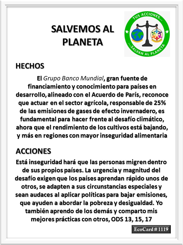 EcoCard #1119 Actuar en el sector agrícola José Antonio Cárdenas Marroquín Uncategorized November 9, 2023 1 Minute Lydia P. Vignau y José A. Cárdenas Más información: Climate Change – The World Bank ReportShare this: Share on X (Opens in new window) X Share on Facebook (Opens in new window) Facebook Like Loading... Published November 9, 2023