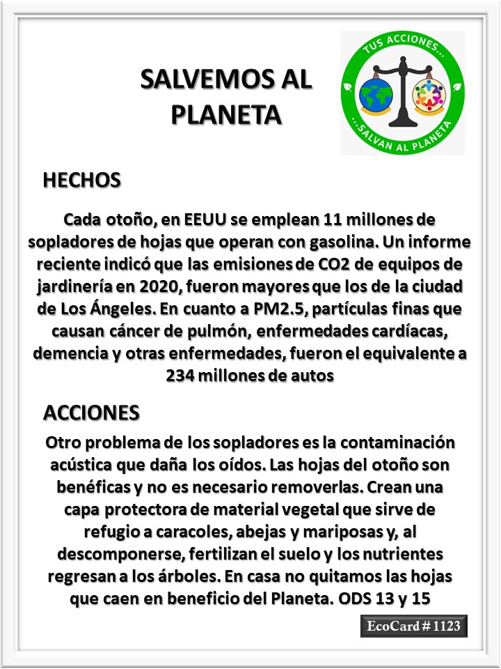 EcoCard #1123 Las hojas de otoño José Antonio Cárdenas Marroquín Uncategorized November 13, 2023 1 Minute Lydia P. Vignau y José A. Cárdenas Más información: Hear that? It’s the sound of leaf blower bans.Share this: Share on X (Opens in new window) X Share on Facebook (Opens in new window) Facebook Like Loading... Published November 13, 2023