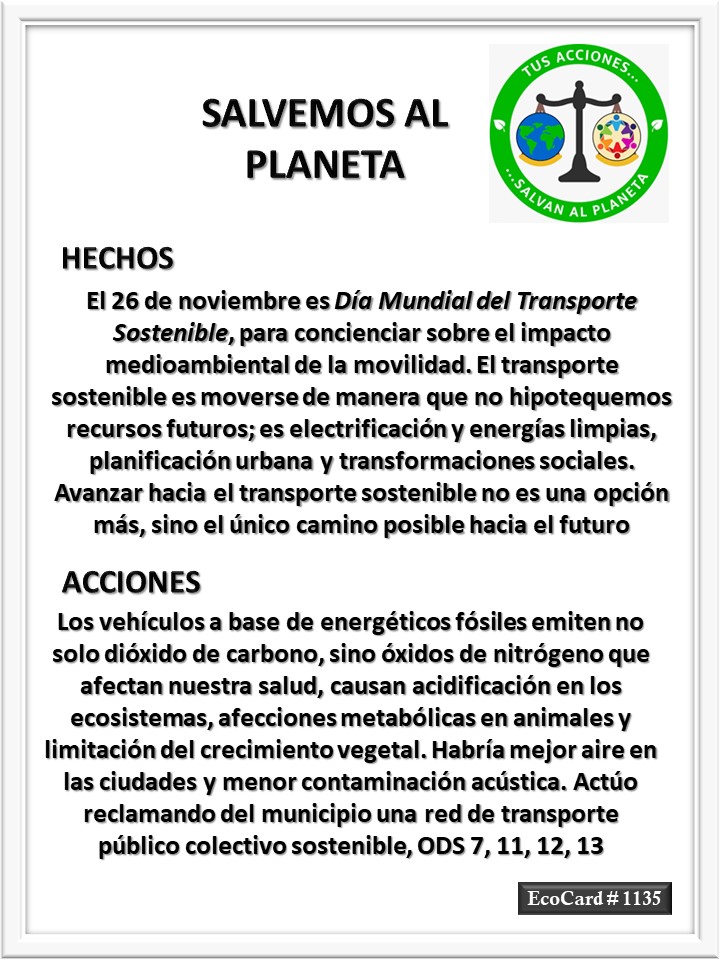 EcoCard #1135 Transporte sostenible José Antonio Cárdenas Marroquín Uncategorized November 26, 2023 1 Minute Lydia P. Vignau y José A. Cárdenas Más información: World Sustainable Transport Day Share this: Click to share on X (Opens in new window) X Click to share on Facebook (Opens in new window) Facebook Like Loading... Published November 26, 2023