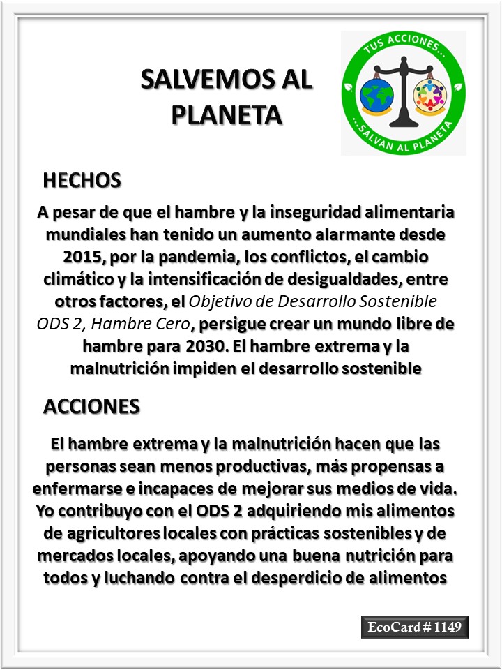 EcoCard #1149 Hambre Cero José Antonio Cárdenas Marroquín Uncategorized December 11, 2023 1 Minute Lydia P. Vignau y José A. Cárdenas Más información: Zero HungerShare this: Share on X (Opens in new window) X Share on Facebook (Opens in new window) Facebook Like Loading... Published December 11, 2023