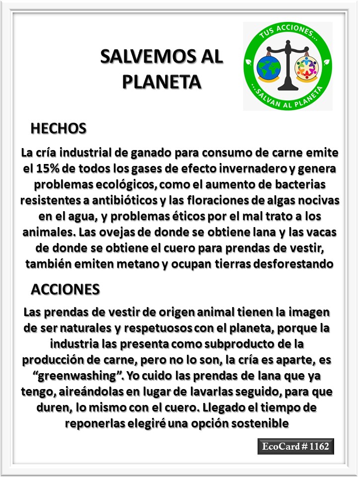EcoCard #1162 Las prendas de vestir José Antonio Cárdenas Marroquín Uncategorized December 24, 2023 1 Minute Lydia P. Vignau y José A. Cárdenas Más información: The greenwashing of wool, explained Más información: This is how much meat and dairy hurt the climateShare this: Share on X (Opens in new window) X Share on Facebook (Opens in new window) Facebook Like Loading... Published December 24, 2023