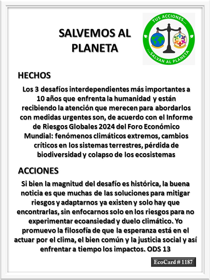 EcoCard #1187 Desafíos históricos José Antonio Cárdenas Marroquín Uncategorized January 21, 2024 1 Minute Lydia P. Vignau y José A. Cárdenas Más información: These are the top 3 climate risks we face — and what to do about themShare this: Share on X (Opens in new window) X Share on Facebook (Opens in new window) Facebook Like Loading... Published January 21, 2024