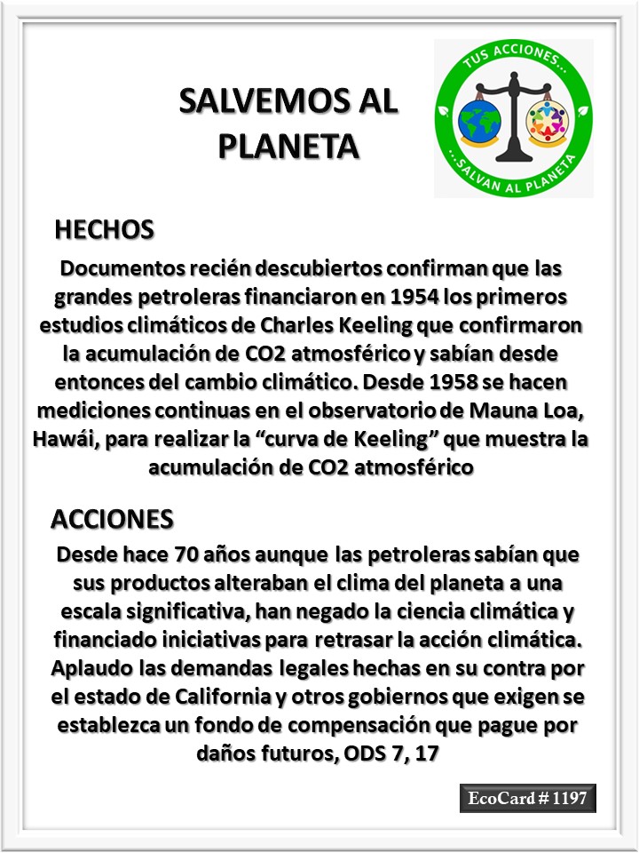 EcoCard #1197 Negación de la ciencia climática José Antonio Cárdenas Marroquín Uncategorized February 1, 2024 1 Minute Lydia P. Vignau y José A. Cárdenas Más información: Smoking gun proof’: fossil fuel industry knew of climate danger as early as 1954, documents showShare this: Share on X (Opens in new window) X Share on Facebook (Opens in new window) Facebook Like Loading... Published February 1, 2024