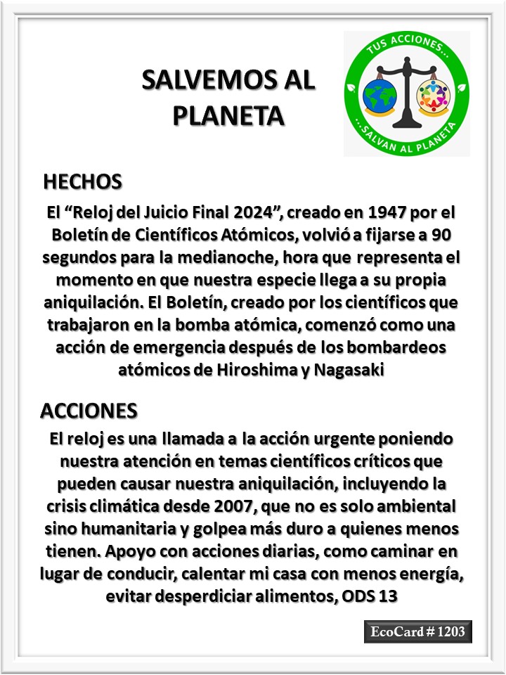 EcoCard #1203 Crisis ambiental y humanitaria José Antonio Cárdenas Marroquín Uncategorized February 7, 2024 1 Minute Lydia P. Vignau y José A. Cárdenas Más información: The Doomsday Clock reveals how close we are to total annihilationShare this: Click to share on X (Opens in new window) X Click to share on Facebook (Opens in new window) Facebook Like Loading... Published February 7, 2024