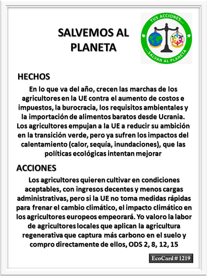 EcoCard #1219 La transición verde José Antonio Cárdenas Marroquín Uncategorized February 23, 2024 1 Minute Lydia P. Vignau y José A. Cárdenas Más información: Explainer-How climate change affects Europe’s farmers Más información: Here’s Why Farmers Are Protesting in Europe Share this: Click to share on X (Opens in new window) X Click to share on Facebook (Opens in new window) Facebook Like Loading... Published February 23, 2024