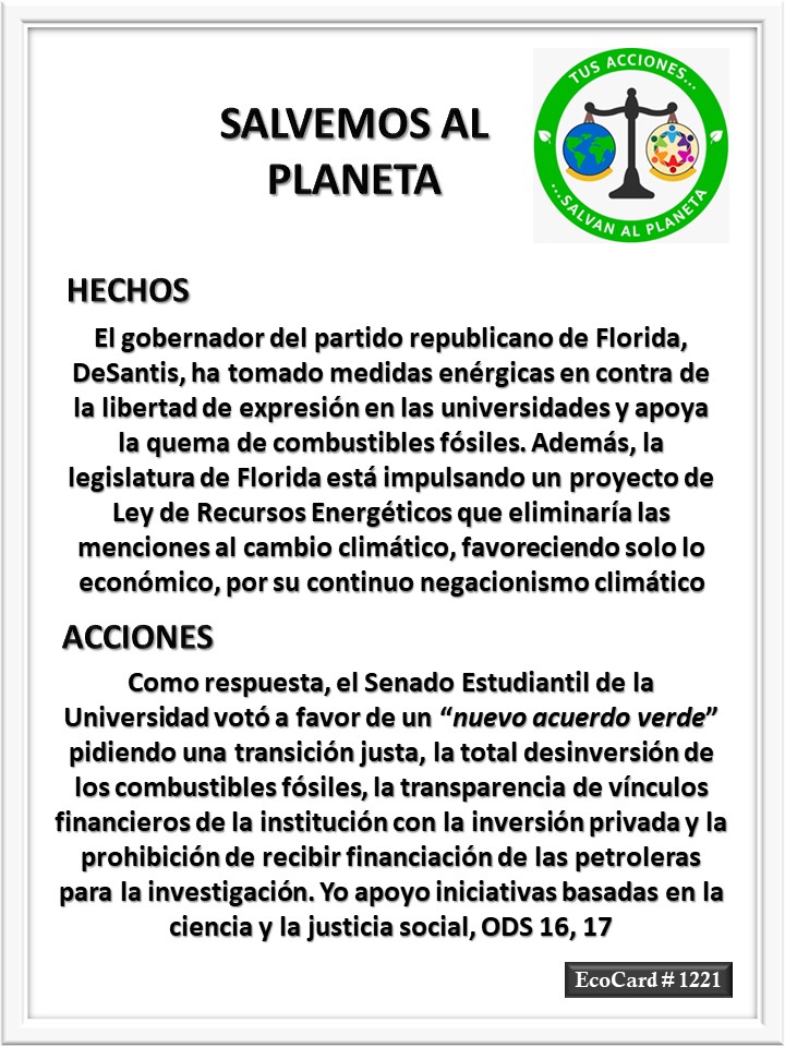 EcoCard #1221 Un nuevo acuerdo verde José Antonio Cárdenas Marroquín Uncategorized February 25, 2024 1 Minute Lydia P. Vignau y José A. Cárdenas Más información: University of Florida student senate passes ‘green new deal’Share this: Click to share on X (Opens in new window) X Click to share on Facebook (Opens in new window) Facebook Like Loading... Published February 25, 2024