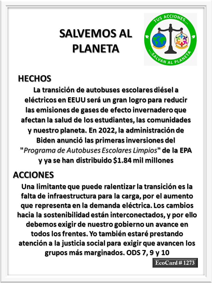EcoCard #1273 Autobuses escolares José Antonio Cárdenas Marroquín Uncategorized April 20, 2024April 20, 2024 1 Minute Lydia P. Vignau y José A. Cárdenas Más información: A Federal Program Is Expanding Electric School Bus Fleets, But There Are Still Some Bumps in the Road Más información: US to invest $1bn in plan to move from diesel to electric school buses Share this: Click to share on X (Opens in new window) X Click to share on Facebook (Opens in new window) Facebook Like Loading... Published April 20, 2024April 20, 2024