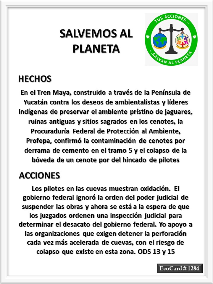 EcoCard #1284 El Tren Maya José Antonio Cárdenas Marroquín Uncategorized May 1, 2024 1 Minute Lydia P. Vignau y José A. Cárdenas Más información: A New Train Is Opening Up the Yucatán, for Better or Worse Más información: Confirma Profepa contaminación de cenotes por derrama de cemento en tramo 5 sur del Tren MayaShare this: Click to share on X (Opens in new window) X Click to share on Facebook (Opens in new window) Facebook Like Loading... Published May 1, 2024