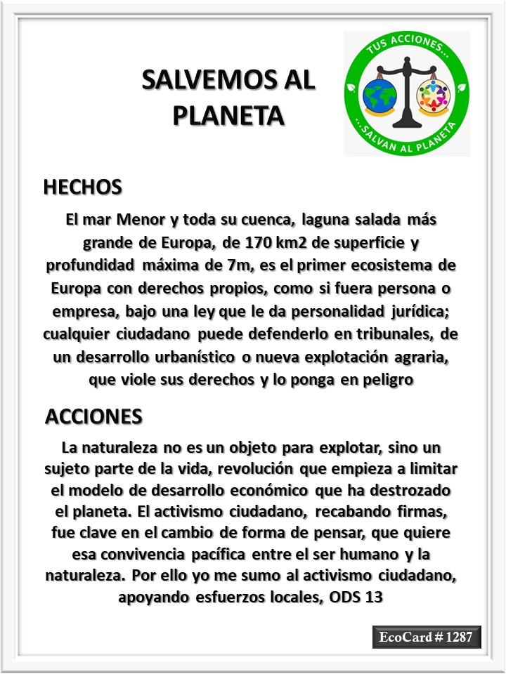 EcoCard #1287 Activismo ciudadano José Antonio Cárdenas Marroquín Uncategorized May 4, 2024May 5, 2024 1 Minute Lydia P. Vignau y José A. Cárdenas Más información: Spain makes history by giving personhood status to salt-water lagoon, thanks to 600,000 citizensShare this: Click to share on X (Opens in new window) X Click to share on Facebook (Opens in new window) Facebook Like Loading... Published May 4, 2024May 5, 2024