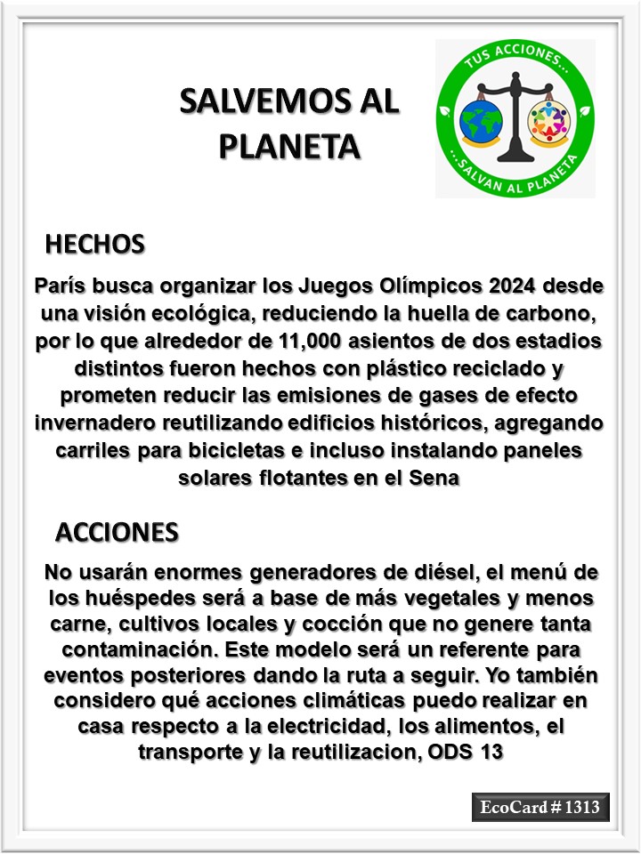 EcoCard #1313 Un referente climático José Antonio Cárdenas Marroquín Uncategorized June 2, 2024 1 Minute Lydia P. Vignau y José A. Cárdenas Más información: How Paris Olympics 2024 could be the ‘greenest-ever’ games | World Economic Forum Share this: Click to share on X (Opens in new window) X Click to share on Facebook (Opens in new window) Facebook Like Loading... Published June 2, 2024
