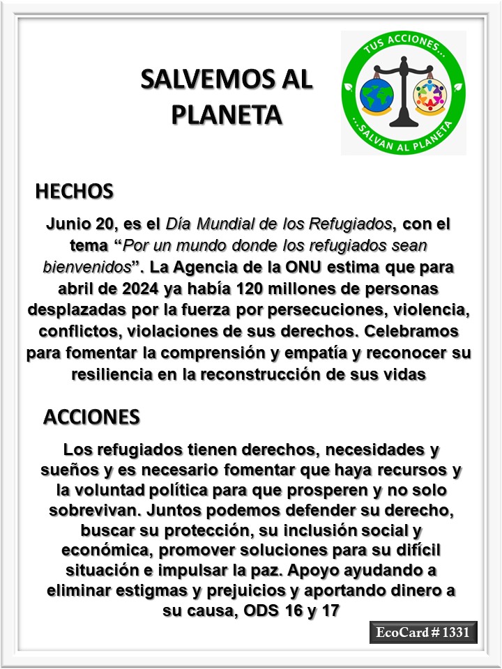 EcoCard #1331 Los refugiados son bienvenidos José Antonio Cárdenas Marroquín Uncategorized June 20, 2024 1 Minute Lydia P. Vignau y José A. Cárdenas Más información: World Refugee Day, 20 June Más información: Global Trends Share this: Share on X (Opens in new window) X Share on Facebook (Opens in new window) Facebook Like Loading... Published June 20, 2024