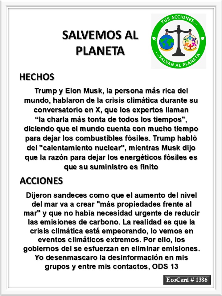 EcoCard #1386 Eliminar emisiones José Antonio Cárdenas Marroquín Uncategorized August 14, 2024 1 Minute Lydia P. Vignau y José A. Cárdenas Más información: ‘The dumbest climate conversation of all time’: experts on the Musk-Trump interview Share this: Share on X (Opens in new window) X Share on Facebook (Opens in new window) Facebook Like Loading... Published August 14, 2024