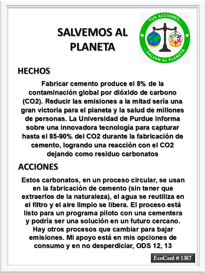 EcoCard #1387 Fabricar cemento José Antonio Cárdenas Marroquín Uncategorized August 15, 2024 1 Minute Lydia P. Vignau y José A. Cárdenas Más información: Researchers patent revolutionary process to stop air pollution at its source: ‘This technology will lead to a more sustainable future for all of us’Share this: Click to share on X (Opens in new window) X Click to share on Facebook (Opens in new window) Facebook Like Loading... Published August 15, 2024