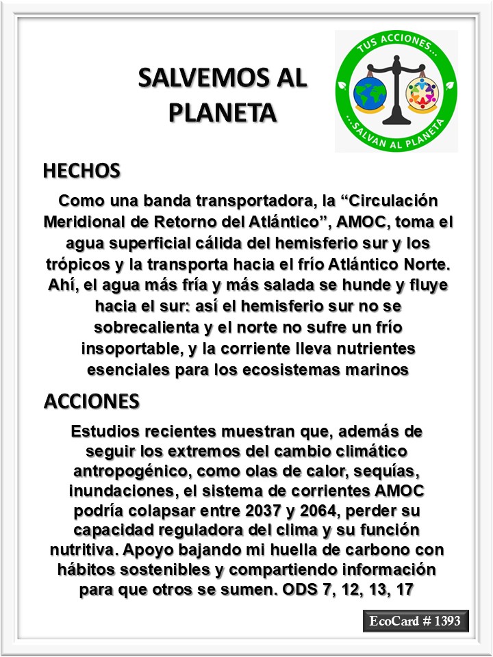EcoCard #1393 Circulación Meridional de Retorno José Antonio Cárdenas Marroquín Uncategorized August 21, 2024 1 Minute Lydia P. Vignau y José A. Cárdenas Más información: A critical system of Atlantic Ocean currents could collapse as early as the 2030s, new research suggestsShare this: Click to share on X (Opens in new window) X Click to share on Facebook (Opens in new window) Facebook Like Loading... Published August 21, 2024