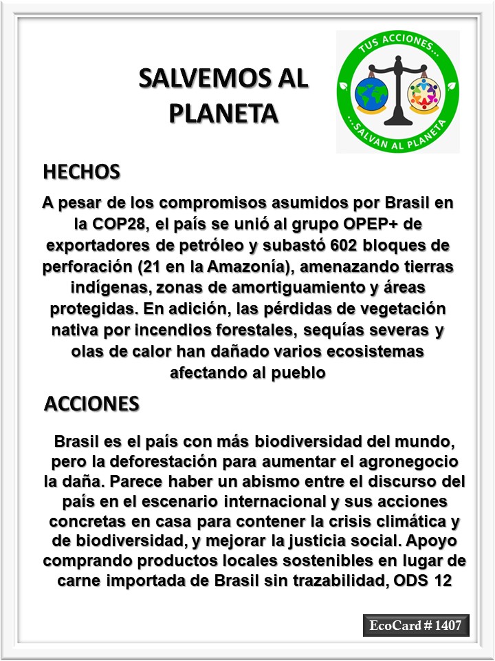 EcoCard #1407 El discurso y las acciones José Antonio Cárdenas Marroquín Uncategorized September 4, 2024 1 Minute Lydia P. Vignau y José A. Cárdenas Más información: Beyond COP28: Brazil must act to tackle the global climate and biodiversity crisis Más información: Brasil registra exportaciones récord de carne fresca en el primer semestre de 2024 Share this: Share on X (Opens in new window) X Share on Facebook (Opens in new window) Facebook Like Loading... Published September 4, 2024