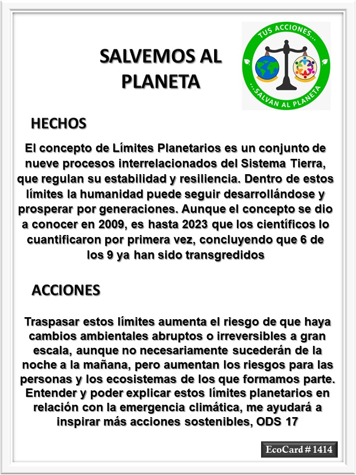 EcoCard #1414 Límites planetarios José Antonio Cárdenas Marroquín Uncategorized September 11, 2024 1 Minute Lydia P. Vignau y José A. Cárdenas Más información: Planetary boundaries Share this: Click to share on X (Opens in new window) X Click to share on Facebook (Opens in new window) Facebook Like Loading... Published September 11, 2024