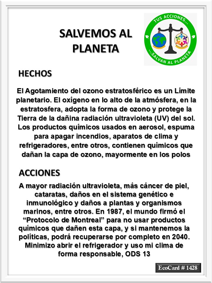 EcoCard #1428 Agotamiento del ozono José Antonio Cárdenas Marroquín Uncategorized September 24, 2024 1 Minute Lydia P. Vignau y José A. Cárdenas Más información: Ozone depletion | Facts, Effects, & Solutions Share this: Share on X (Opens in new window) X Share on Facebook (Opens in new window) Facebook Like Loading... Published September 24, 2024
