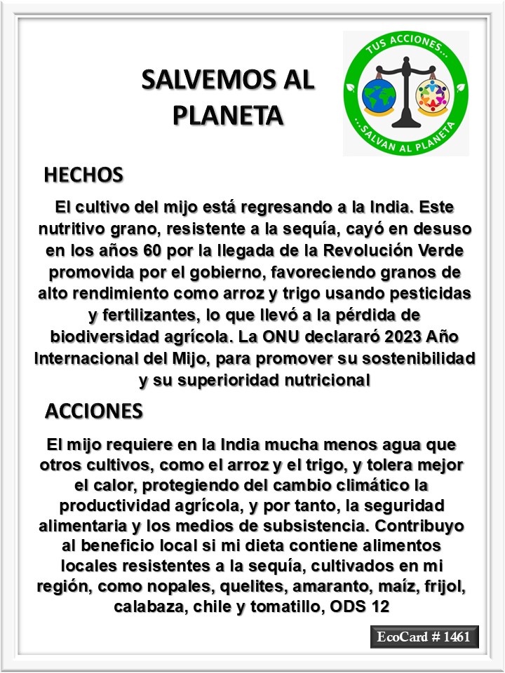 EcoCard #1461 Alimentos regionales José Antonio Cárdenas Marroquín Uncategorized November 14, 2024 1 Minute Lydia P. Vignau y José A. Cárdenas Más información: Millets Are Making a Comeback in India Share this: Share on X (Opens in new window) X Share on Facebook (Opens in new window) Facebook Like Loading... Published November 14, 2024