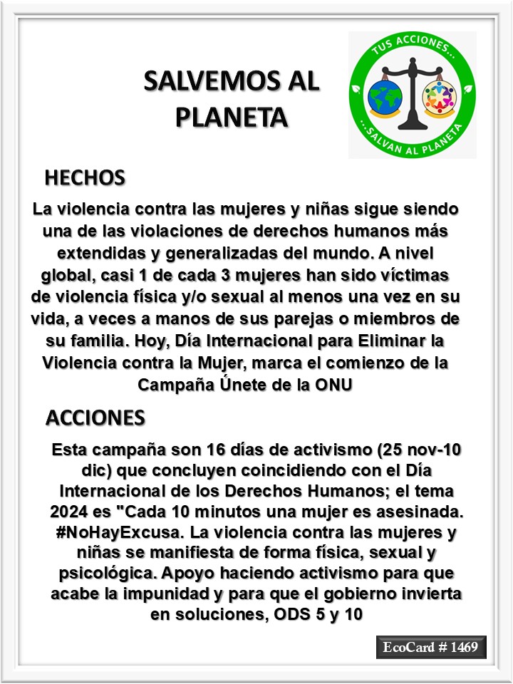 EcoCard #1469 Violencia contra mujeres José Antonio Cárdenas Marroquín Uncategorized November 25, 2024 1 Minute Lydia P. Vignau y José A. Cárdenas Más información: 25 November – International Day for the Elimination of Violence against WomenShare this: Share on X (Opens in new window) X Share on Facebook (Opens in new window) Facebook Like Loading... Published November 25, 2024