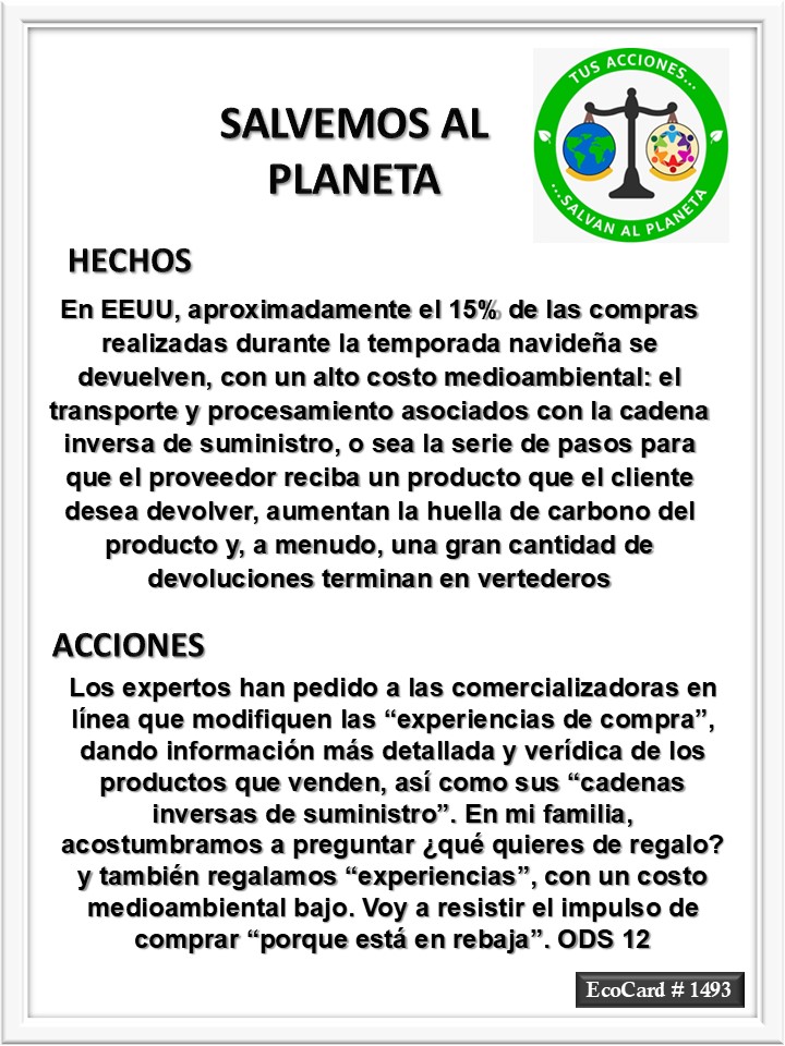 EcoCard #1493 Compras navideñas José Antonio Cárdenas Marroquín Uncategorized December 20, 2024December 20, 2024 1 Minute Lydia P. Vignau y José A. Cárdenas Más información: Holiday Shopping Returns Have a High Environmental Cost. Here’s How Consumers Can HelpShare this: Click to share on X (Opens in new window) X Click to share on Facebook (Opens in new window) Facebook Like Loading... Published December 20, 2024December 20, 2024