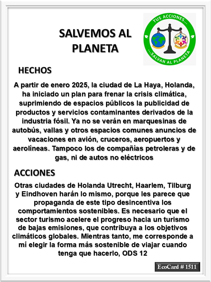 EcoCard #1511 Espacios publicos de publicidad José Antonio Cárdenas Marroquín Uncategorized January 8, 2025January 9, 2025 1 Minute Lydia P. Vignau y José A. Cárdenas Más información: La Haya se convierte en la primera ciudad en prohibir anuncios de la industria fósil por la crisis climáticaShare this: Share on X (Opens in new window) X Share on Facebook (Opens in new window) Facebook Like Loading... Published January 8, 2025January 9, 2025