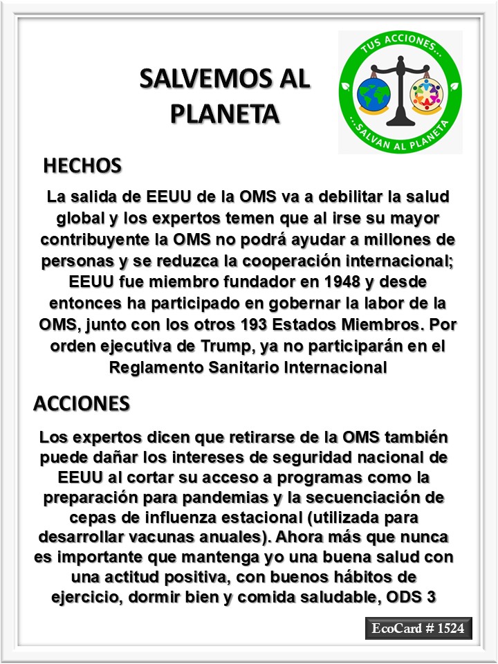 EcoCard #1524 La salud global José Antonio Cárdenas Marroquín Uncategorized January 24, 2025January 24, 2025 1 Minute Lydia P. Vignau y José A. Cárdenas Más información: WHO comments on United States’ announcement of intent to withdraw Share this: Click to share on X (Opens in new window) X Click to share on Facebook (Opens in new window) Facebook Like Loading... Published January 24, 2025January 24, 2025