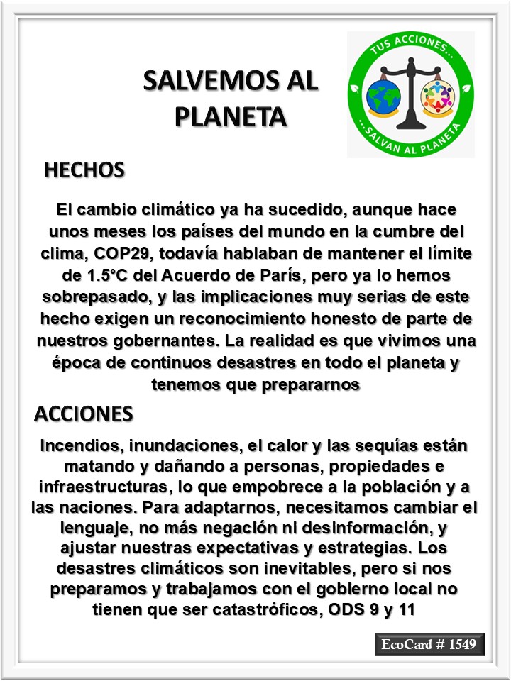 EcoCard #1549 Cambiar el lenguaje José Antonio Cárdenas Marroquín Uncategorized February 18, 2025 1 Minute Lydia P. Vignau y José A. Cárdenas Más información: Extreme weather is our new reality. We must accept it and begin planningShare this: Share on X (Opens in new window) X Share on Facebook (Opens in new window) Facebook Like Loading... Published February 18, 2025