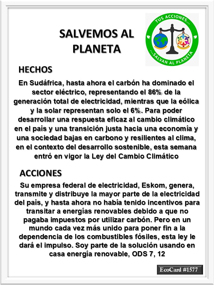 EcoCard #1577 Energía renovable José Antonio Cárdenas Marroquín Uncategorized March 20, 2025March 20, 2025 1 Minute Lydia P. Vignau y José A. Cárdenas Más información: South Africa’s Climate Change Act is now in effect Share this: Share on X (Opens in new window) X Share on Facebook (Opens in new window) Facebook Like Loading... Published March 20, 2025March 20, 2025