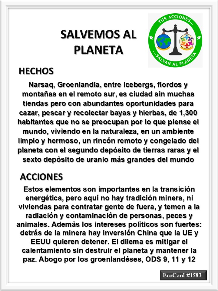 EcoCard #1583 Mantener la paz José Antonio Cárdenas Marroquín Uncategorized March 26, 2025 1 Minute Lydia P. Vignau y José A. Cárdenas Más información: Greenland might open a vast uranium deposit to mining. Locals say it could alter their way of life Share this: Share on X (Opens in new window) X Share on Facebook (Opens in new window) Facebook Like Loading... Published March 26, 2025