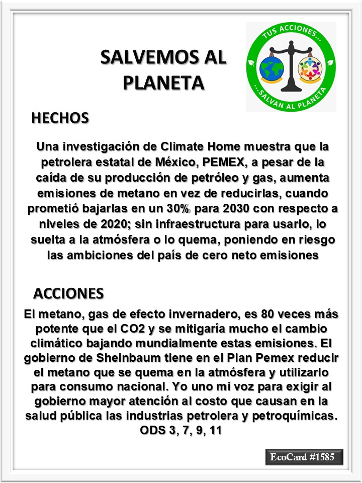 EcoCard #1585 Reducir la quema de metano José Antonio Cárdenas Marroquín Uncategorized March 28, 2025March 28, 2025 1 Minute Lydia P. Vignau y José A. Cárdenas Más información: Más información: Oil giant Pemex fails to control methane emissions, threatening Mexico’s net zero goal Share this: Share on X (Opens in new window) X Share on Facebook (Opens in new window) Facebook Like Loading... Published March 28, 2025March 28, 2025