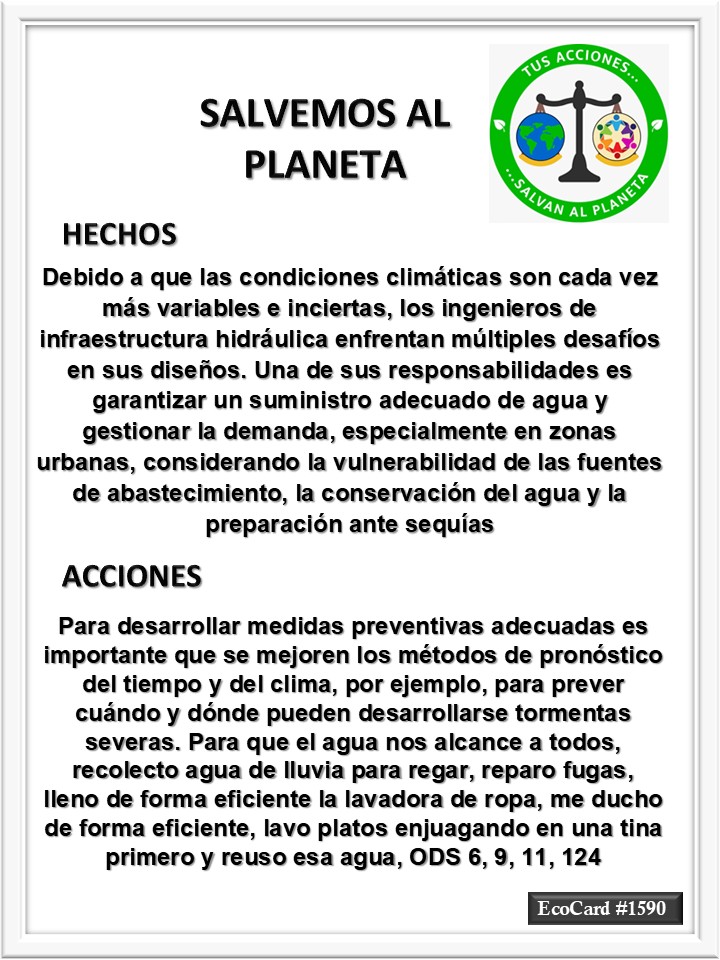 EcoCard #1590 Medidas preventivas José Antonio Cárdenas Marroquín Uncategorized April 2, 2025 1 Minute Lydia P. Vignau y José A. Cárdenas Más información: Water infrastructure engineers confront an uncertain, changing climate Share this: Click to share on X (Opens in new window) X Click to share on Facebook (Opens in new window) Facebook Like Loading... Published April 2, 2025